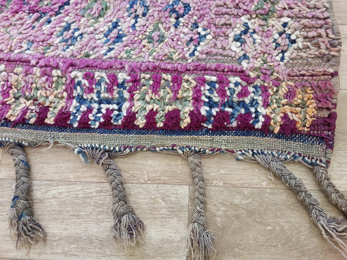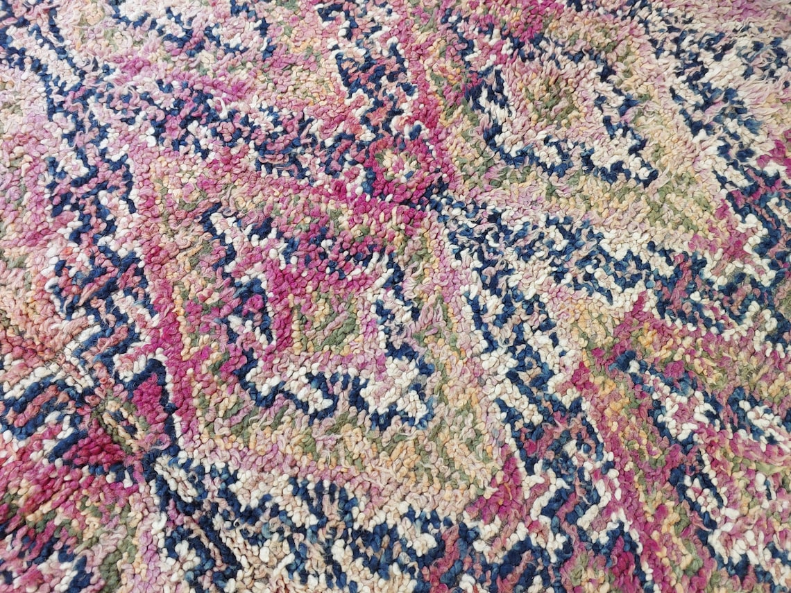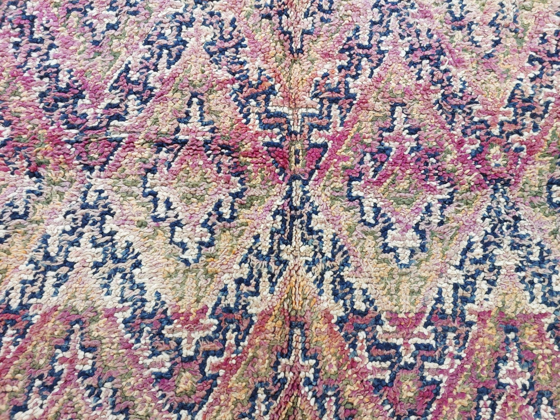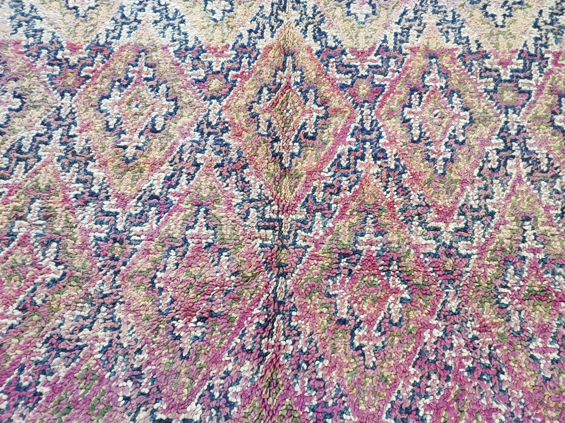Plush pile vintage Beni M'Guild Moroccan rug — handwoven by skilled Berber artisans, featuring reversible design and vibrant tribal motifs.