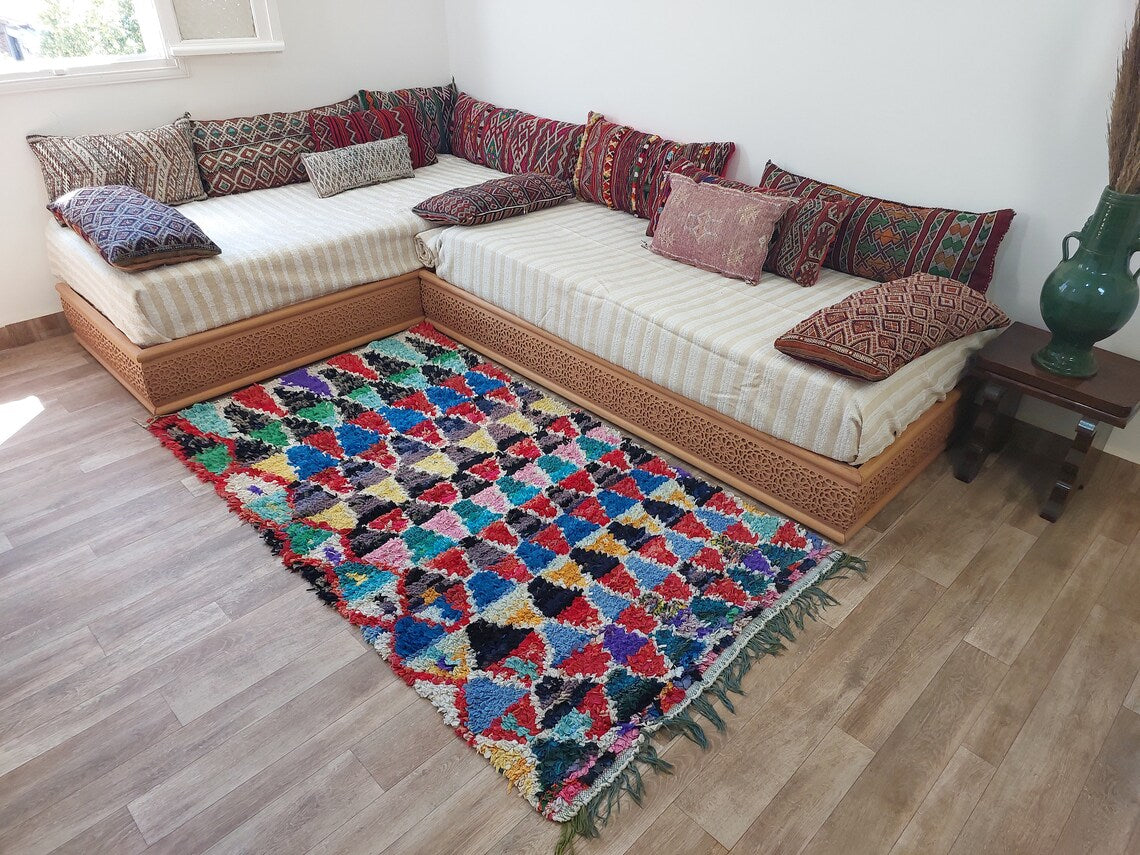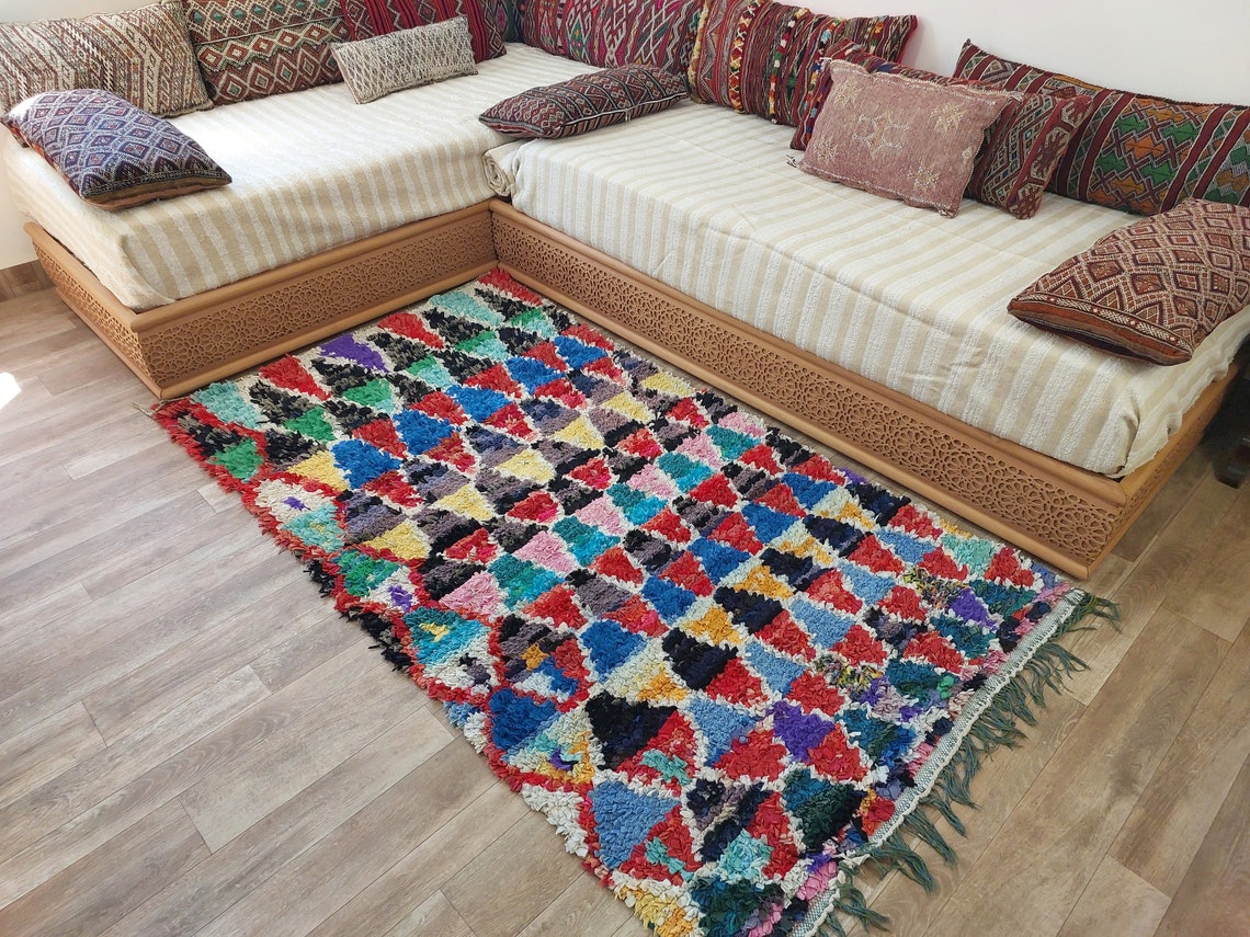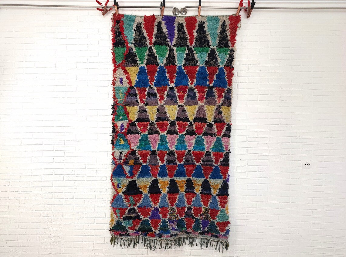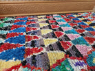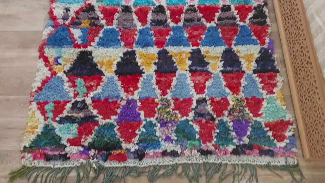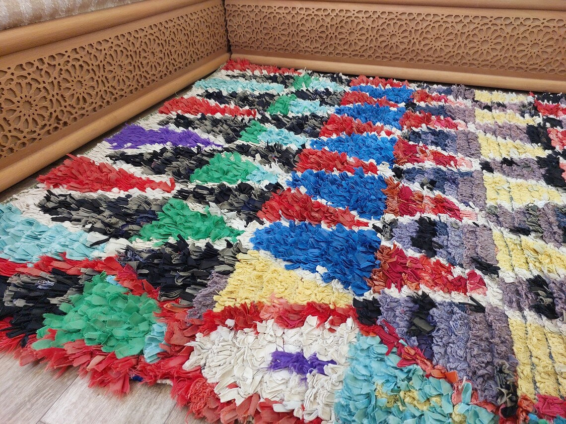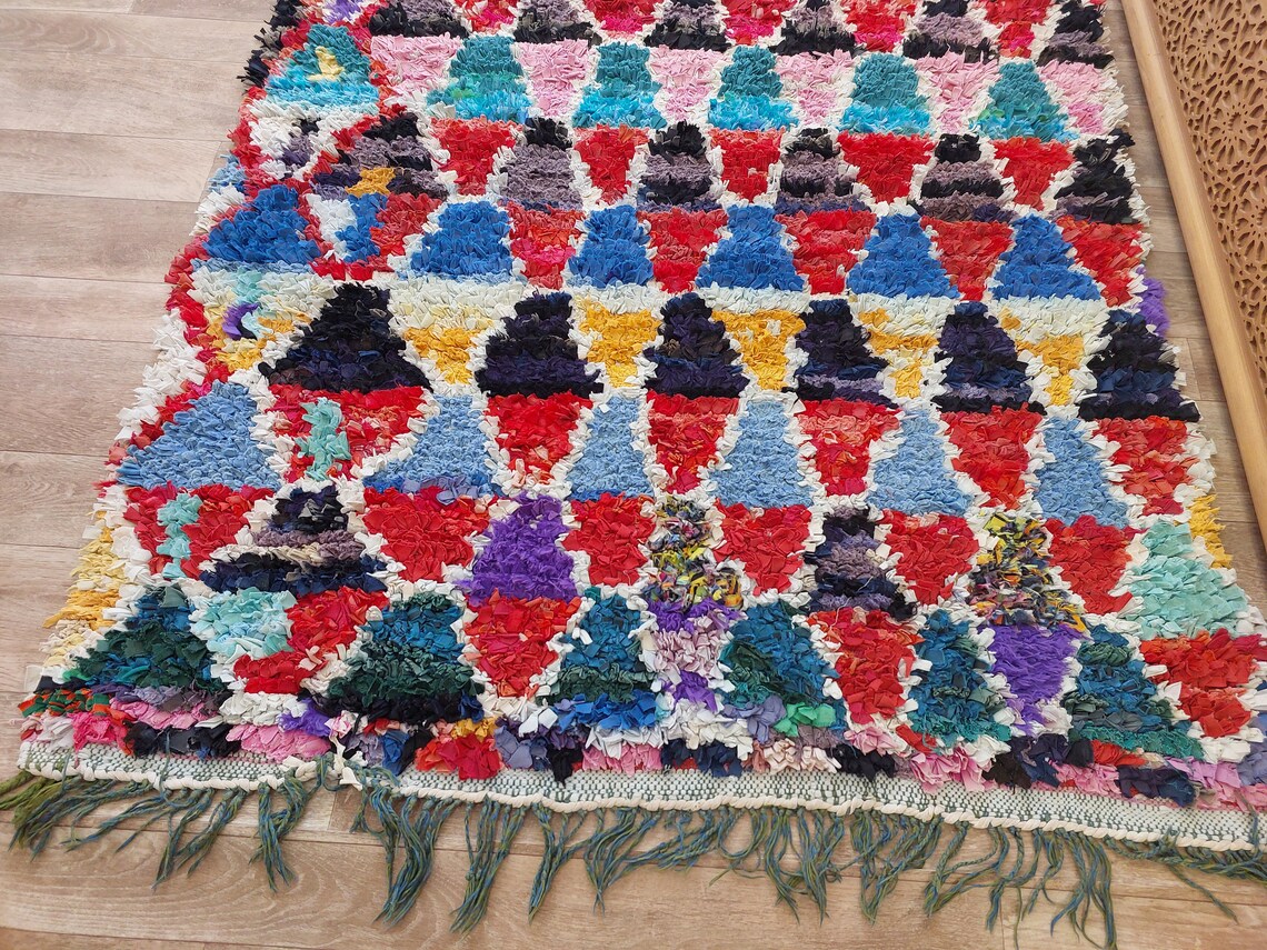 Discover the unique charm of this handmade vintage Boucherouite rug, a vibrant piece of Moroccan heritage. Meticulously woven by skilled artisans using recycled fabrics, wool, and cotton, it features a colorful patchwork design. Perfect for any room, it can be used as a floor covering, wall hanging, or statement piece, bringing warmth, texture, and sustainable elegance to your home.