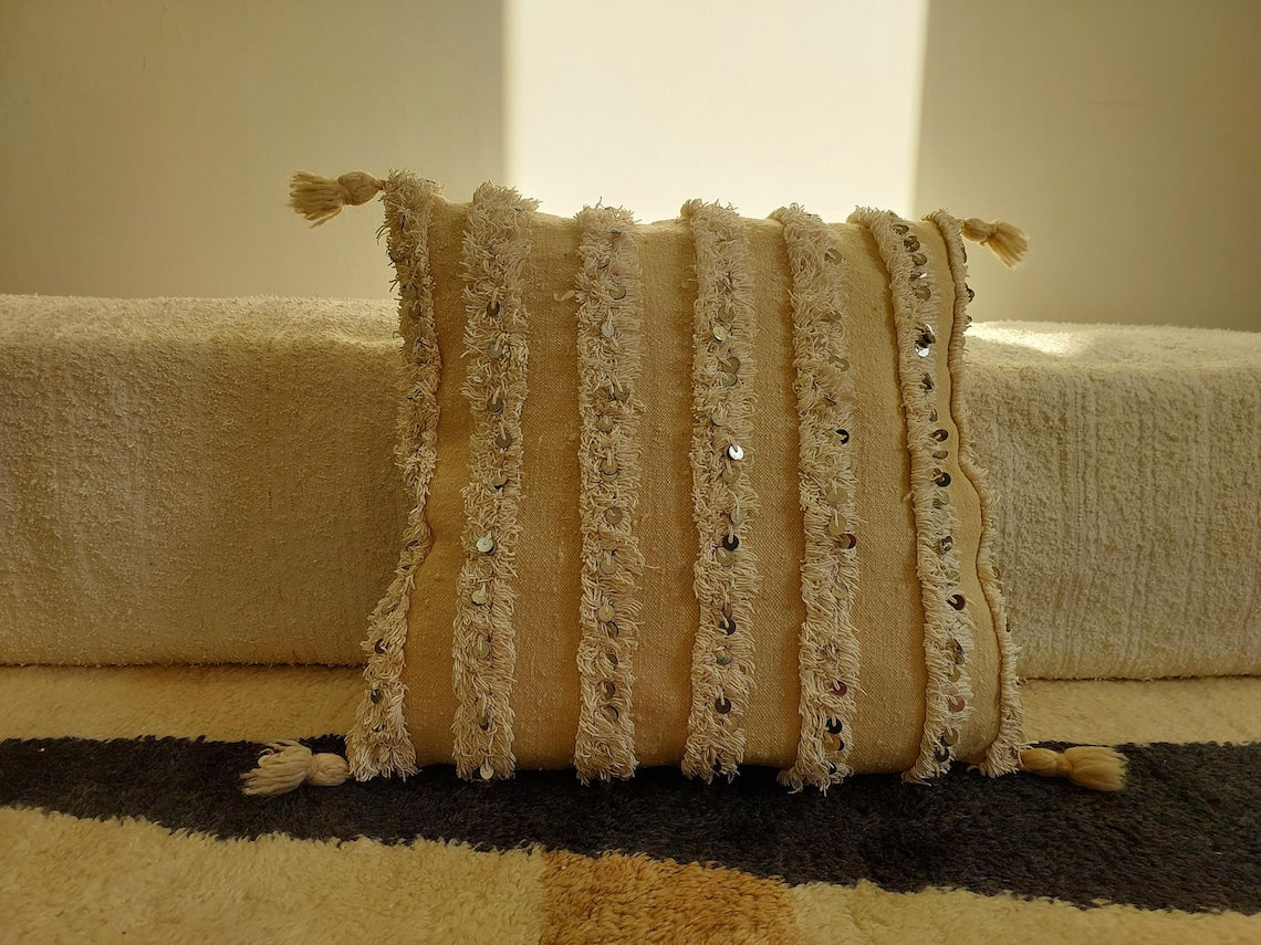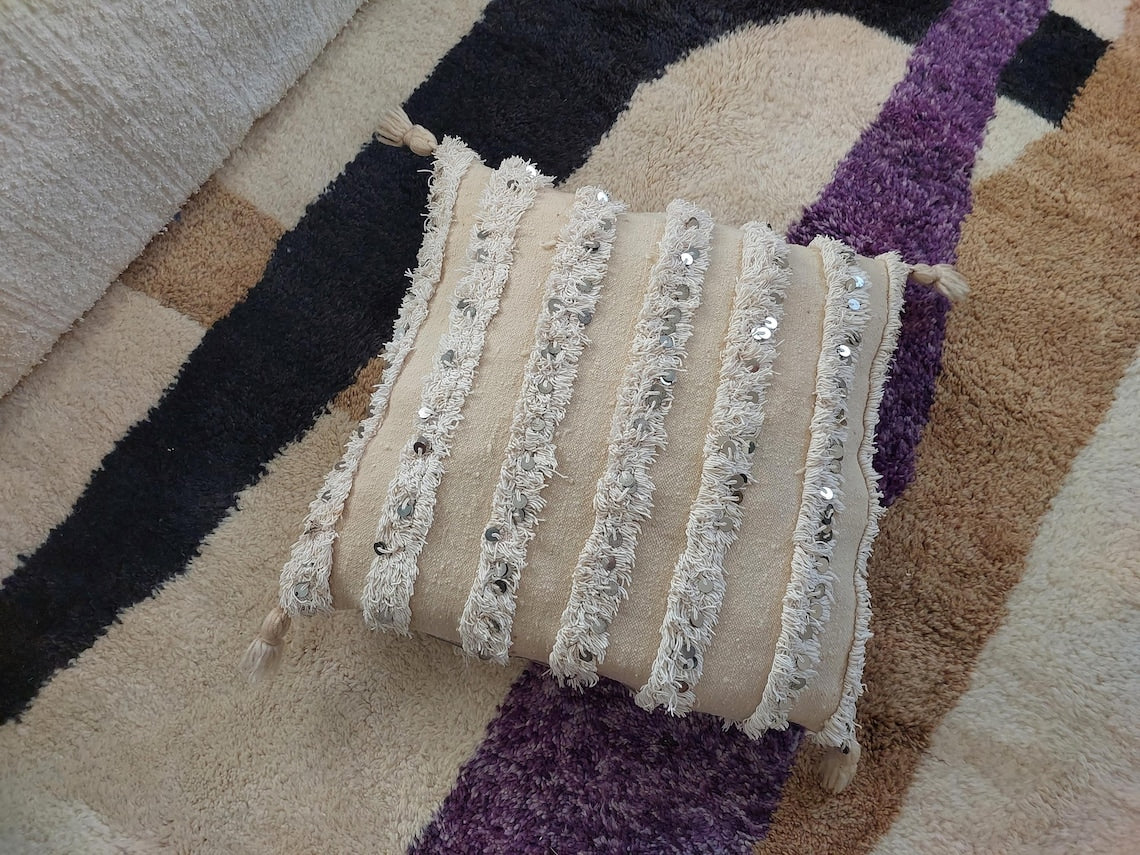 Vintage Moroccan Handira Pillow Case — Cotton, Wool & Sequins, Double-Sided, Handcrafted By Moroccan Artisans
