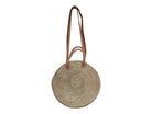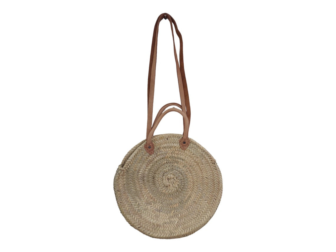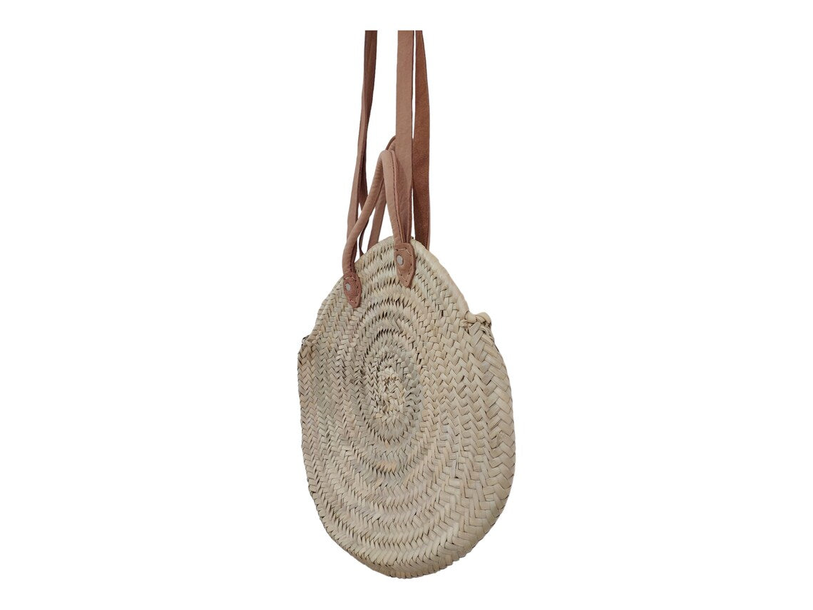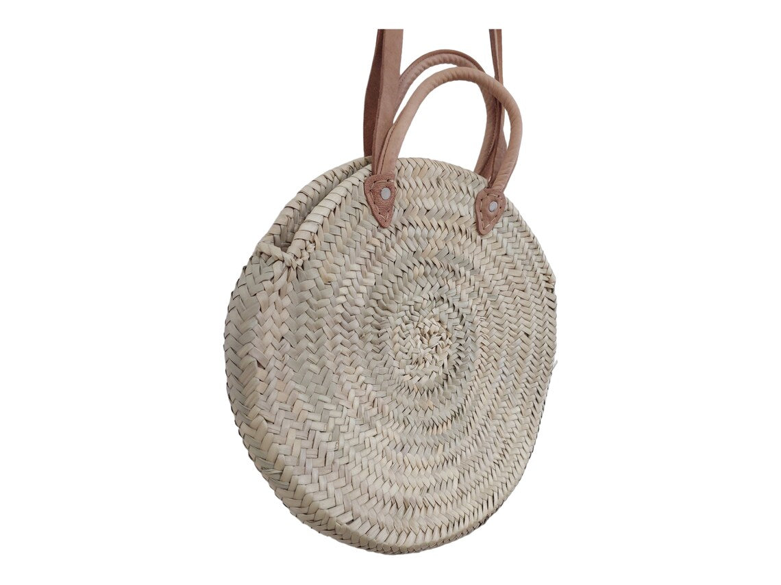 Handcrafted Moroccan Round Wicker Beach Bag With Double Leather Handles - Flat Weave Straw Basket