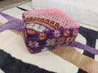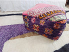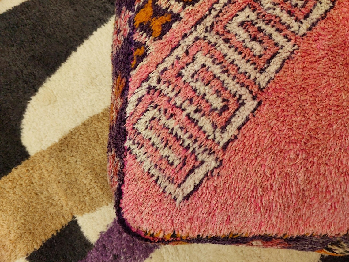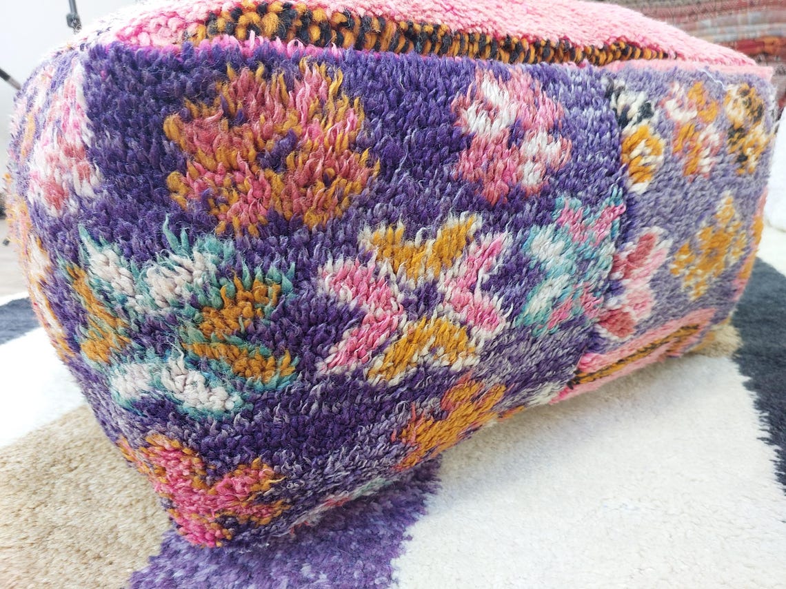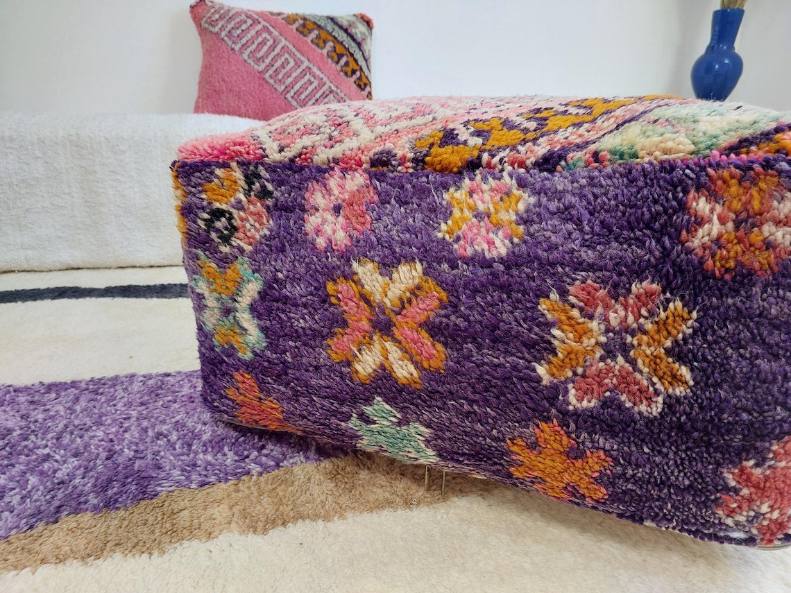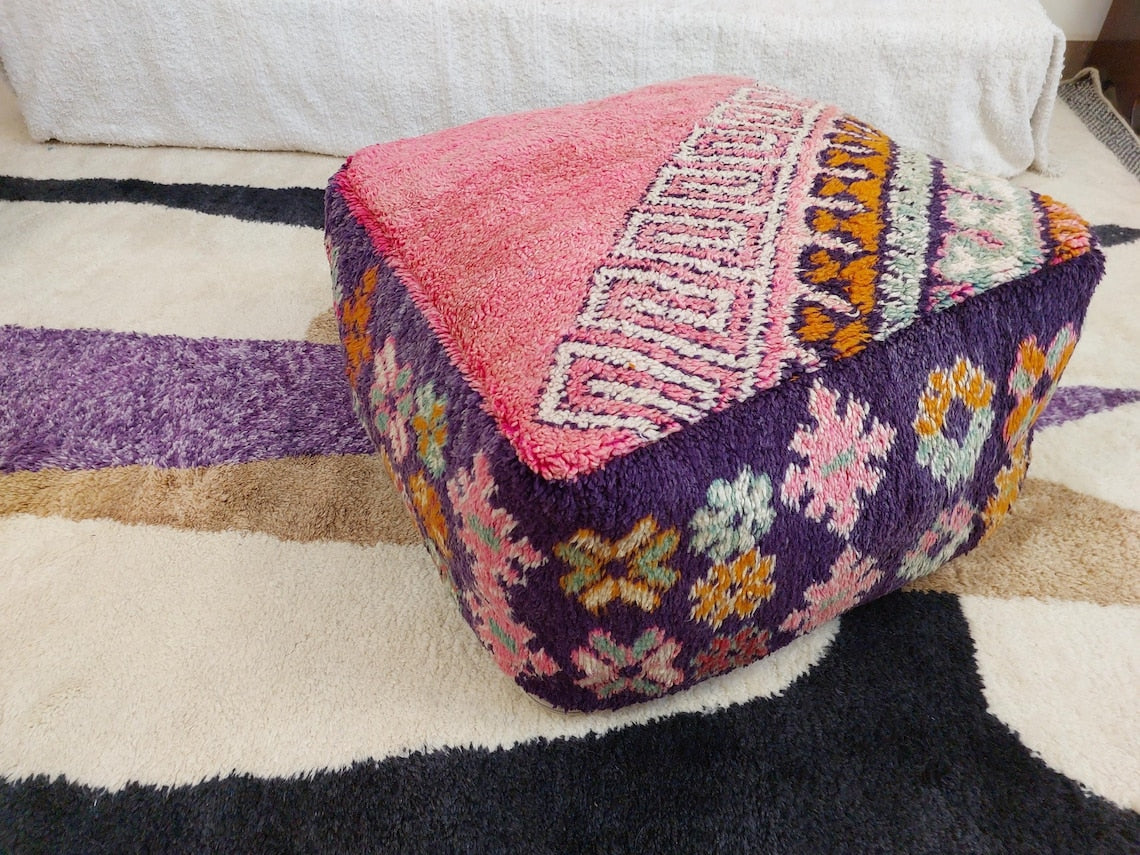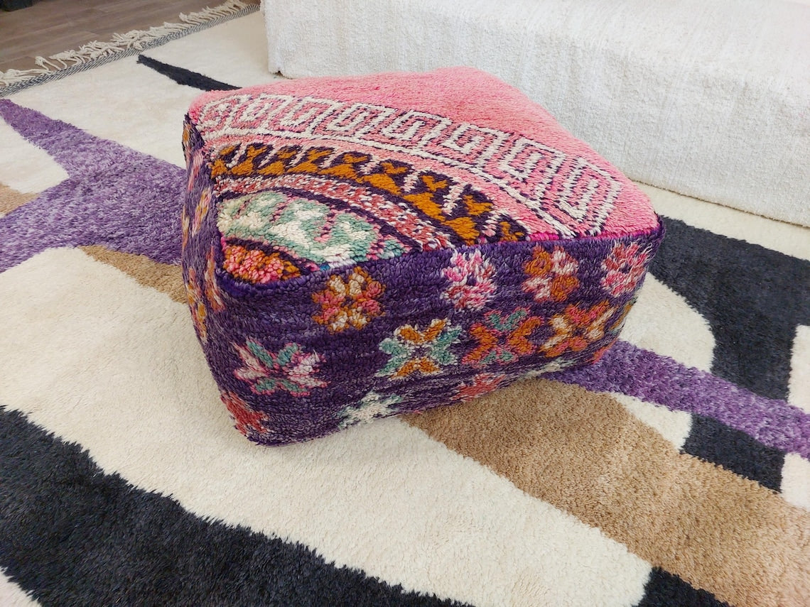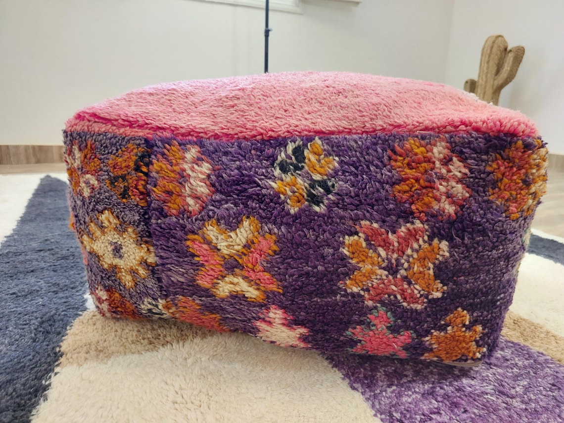 Celebrate color and pattern with this traditional Moroccan floor ottoman handcrafted from a vintage handmade Boujaad rug. This high-quality pouf showcases flat pink, green, orange, and purple tones, bringing bold character and warmth to any space. Each piece is truly one of a kind, preserving the craft traditions and Berber symbolism of generations past. The hand-knotted patterns and rich patchwork colors turn this ottoman into a striking conversation piece. Perfect for modern minimalist homes, chalets, or cozy living spaces, it adds texture, history, and artistic depth wherever it is placed.
