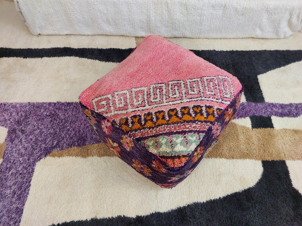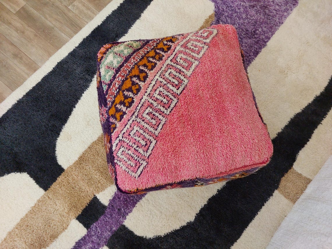 Vintage Moroccan Berber Wool Pouf: Handmade Colorful Floor Cushion Ottoman For Bohemian Decor , High Quality Pink Pouf