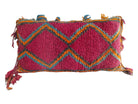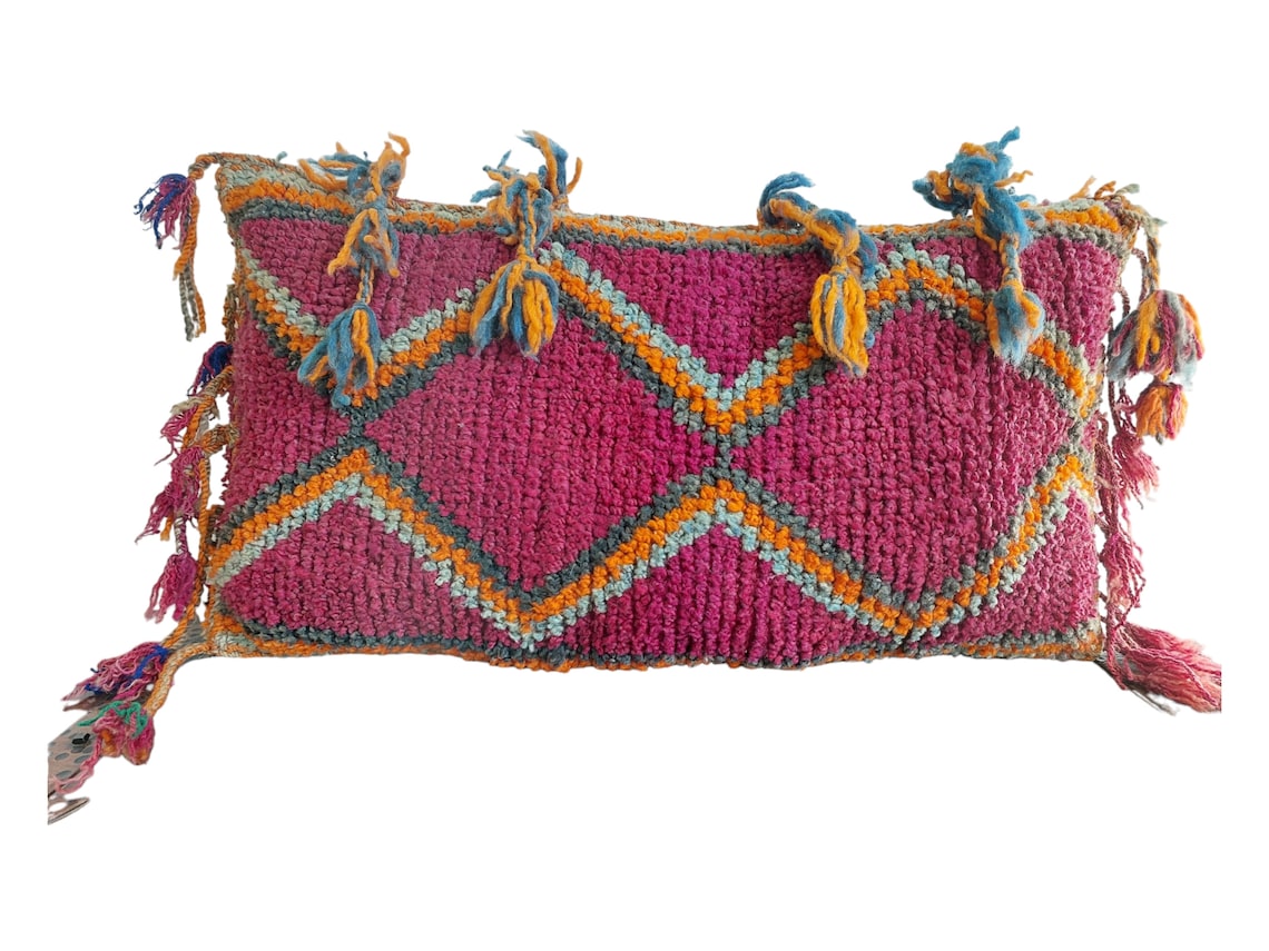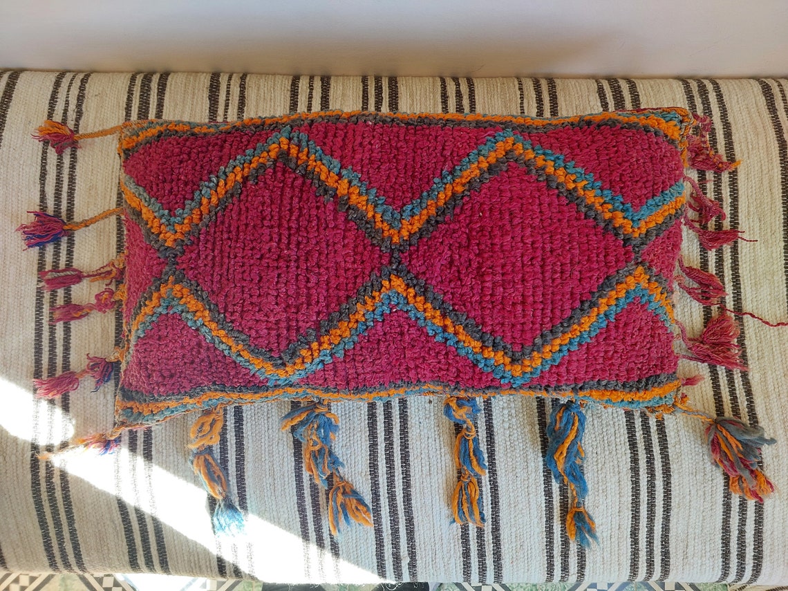 This vintage Moroccan pillow is handmade as a full cushion, not cut from a rug, showcasing authentic Berber craftsmanship from the Aït Bou Ichaouen tribe. Measuring 14 × 24 inches (35 × 60 cm), it is in excellent vintage condition with no holes or stains. Ships unstuffed with a small opening for easy stuffing and simple hand stitching closure. Ideal for layering on sofas or beds to create a bohemian look. Cleaned, washed, and ready to use.