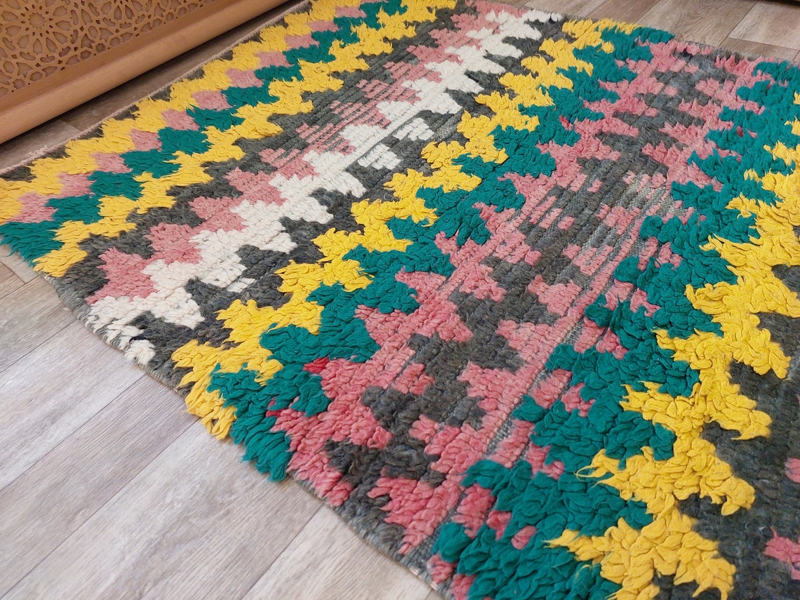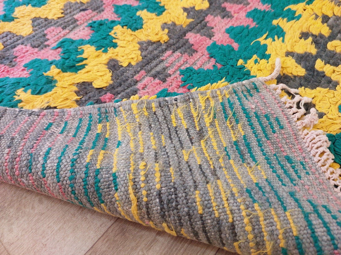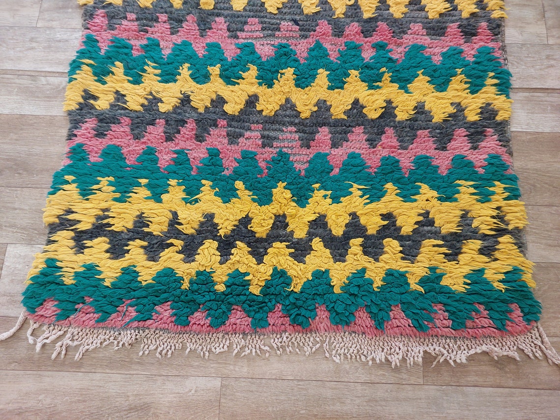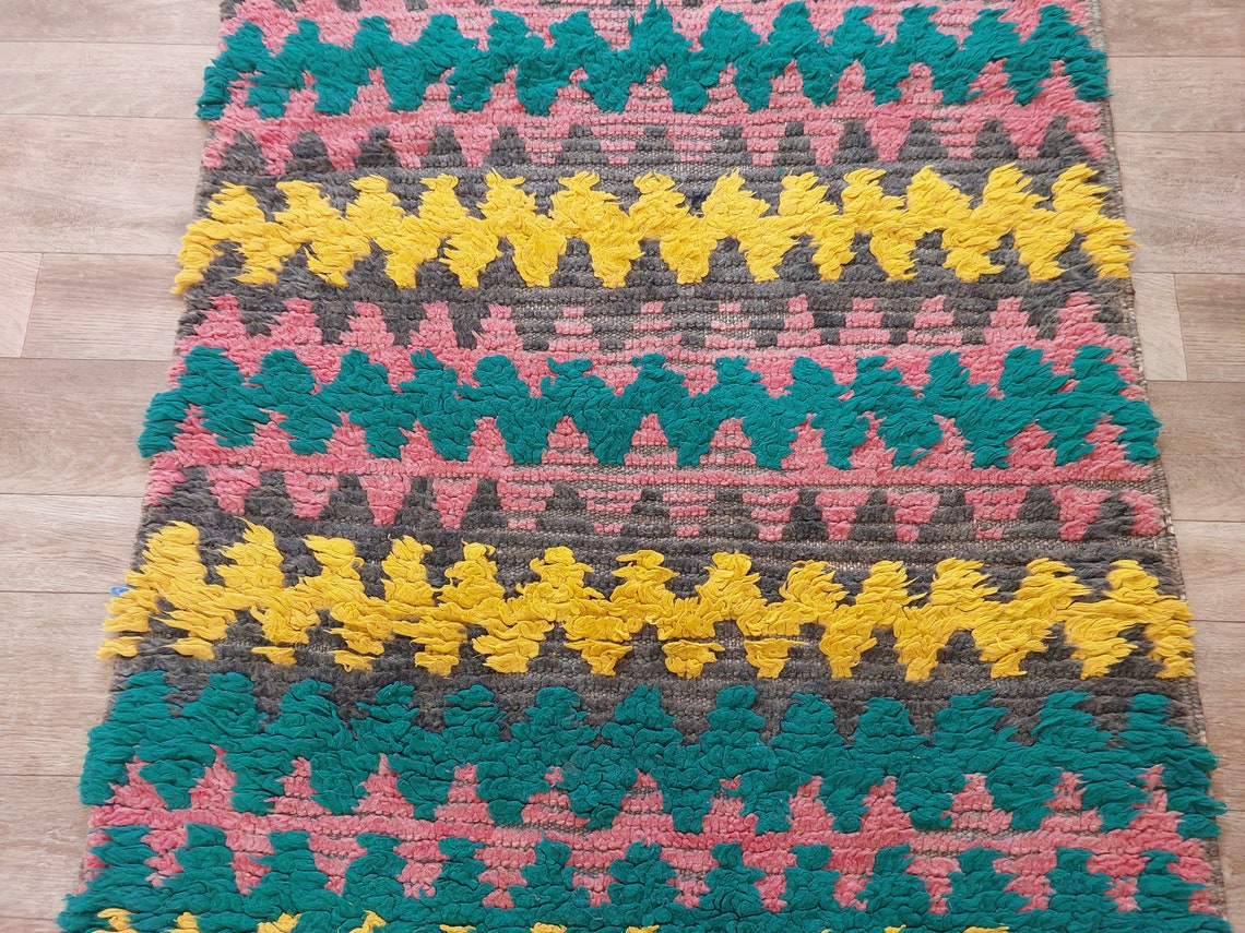 This vintage Boujaad Boucherouite rug is handcrafted from wool and recycled fabrics by Moroccan women. Each piece is unique, showcasing bright colors and a playful patchwork design. Perfect for adding character to any space, whether as a runner rug, wall hanging, or decorative accent.