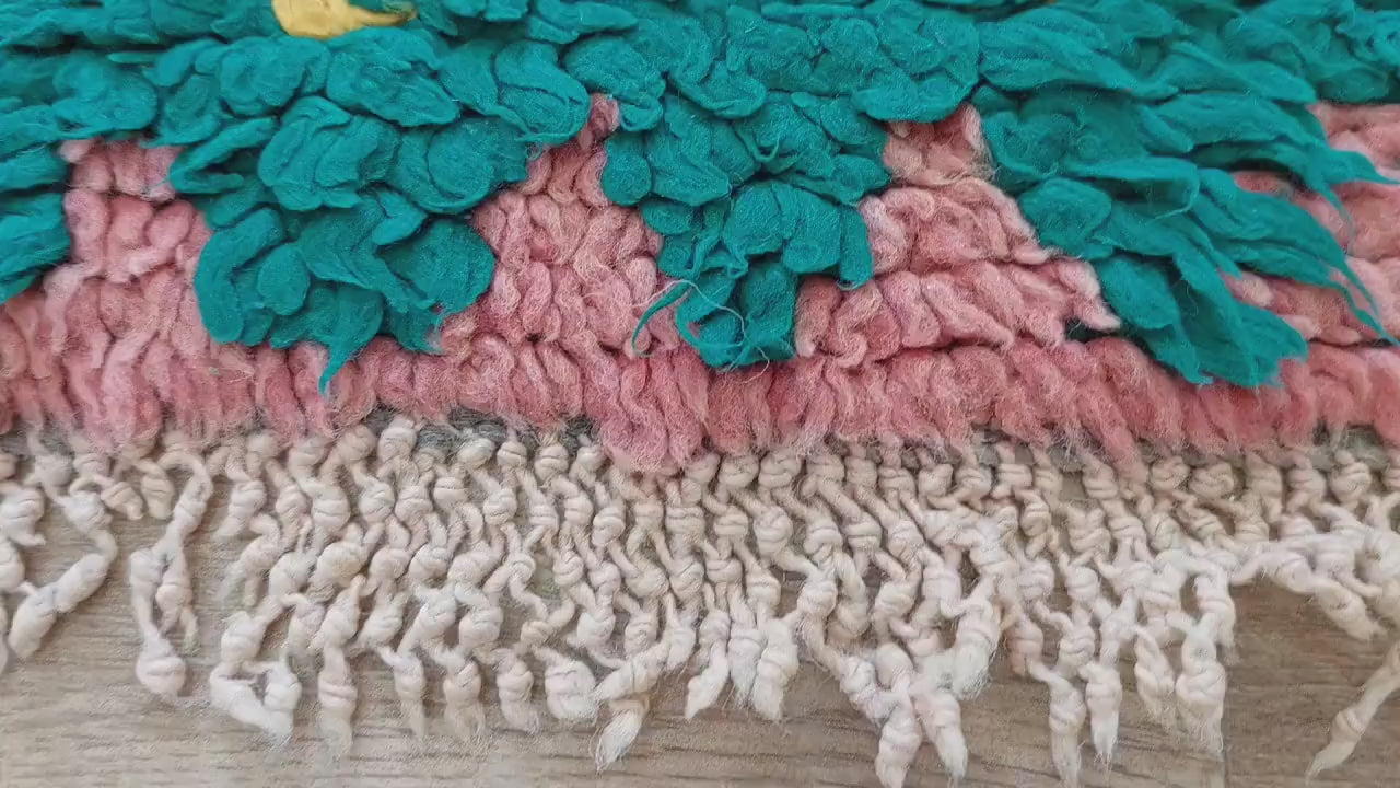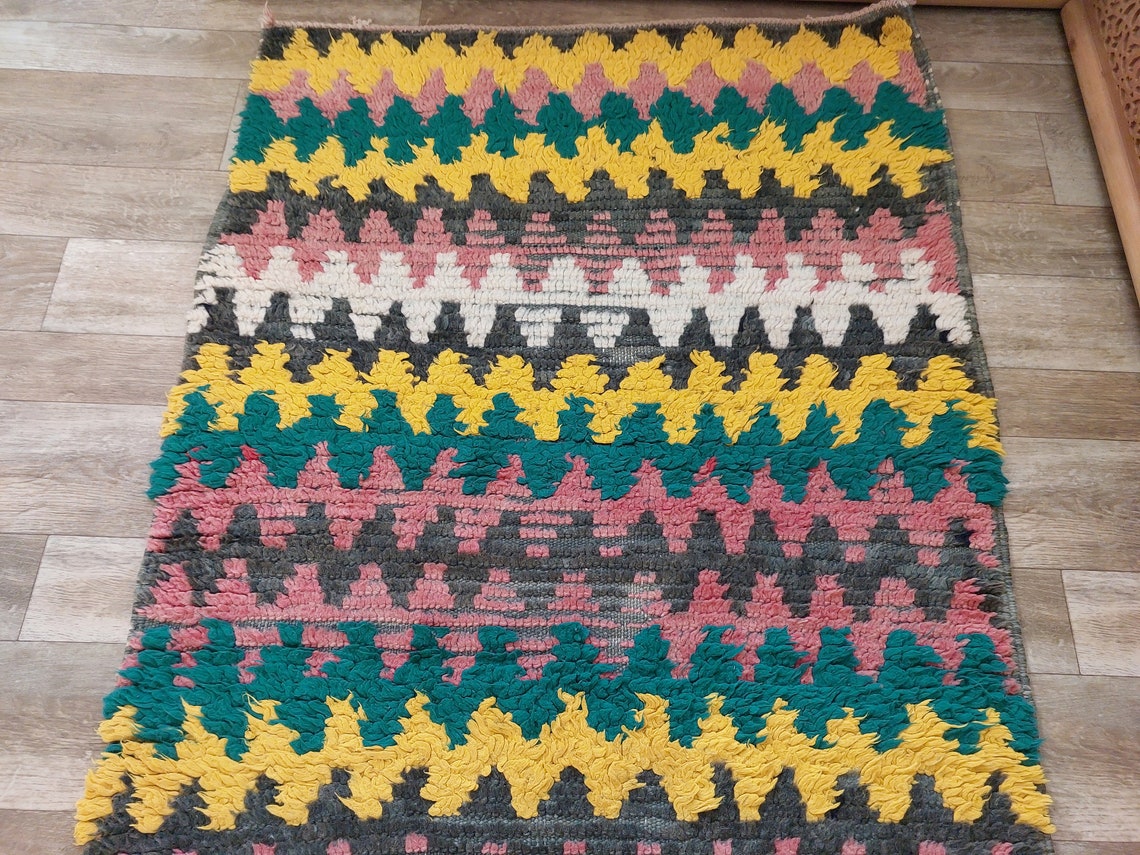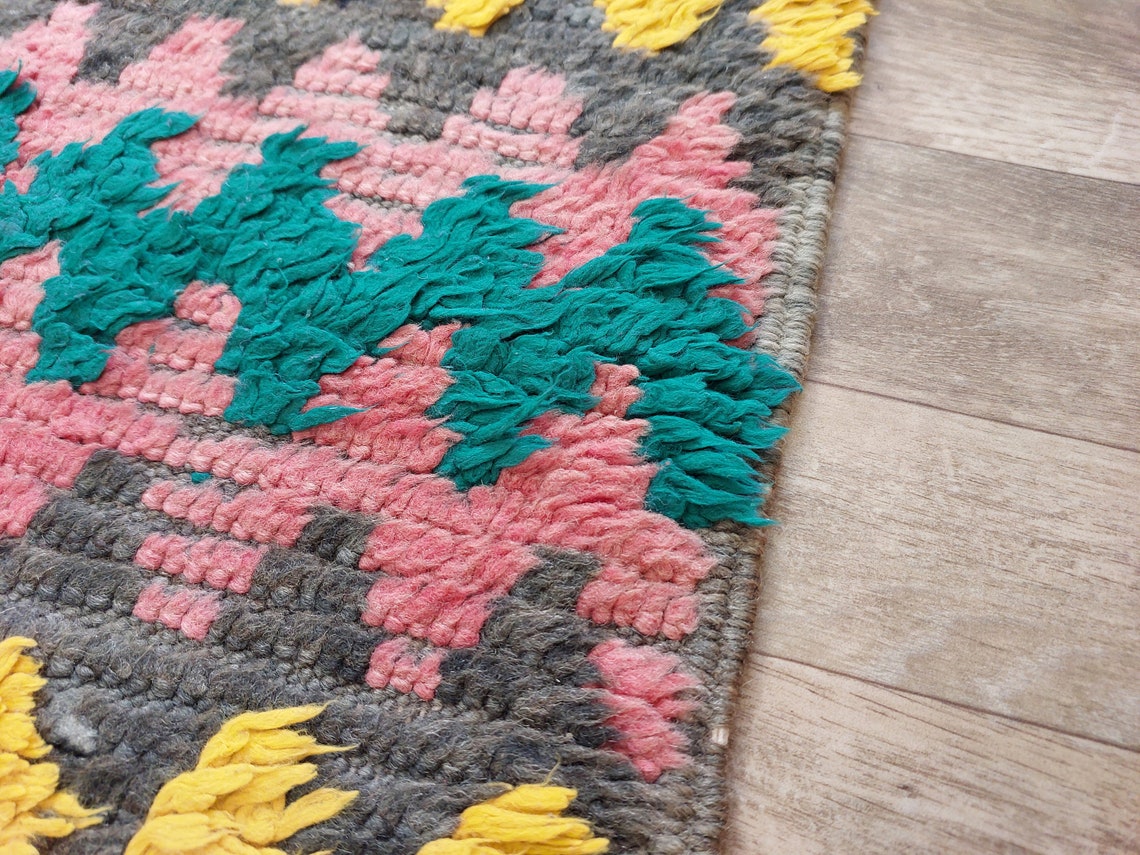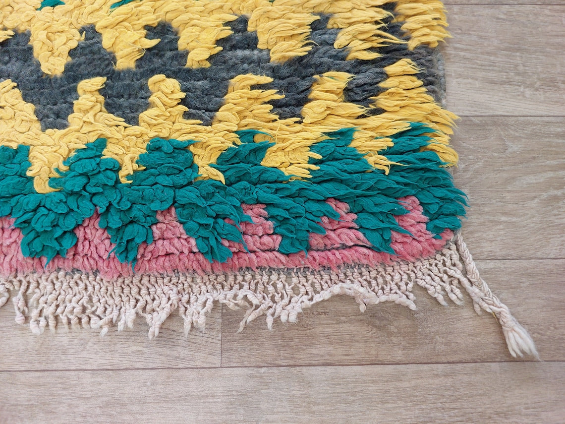 This vintage Boujaad Boucherouite rug is handcrafted from wool and recycled fabrics by Moroccan women. Each piece is unique, showcasing bright colors and a playful patchwork design. Perfect for adding character to any space, whether as a runner rug, wall hanging, or decorative accent.