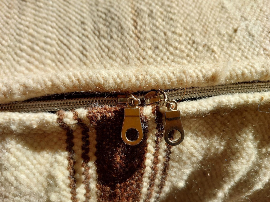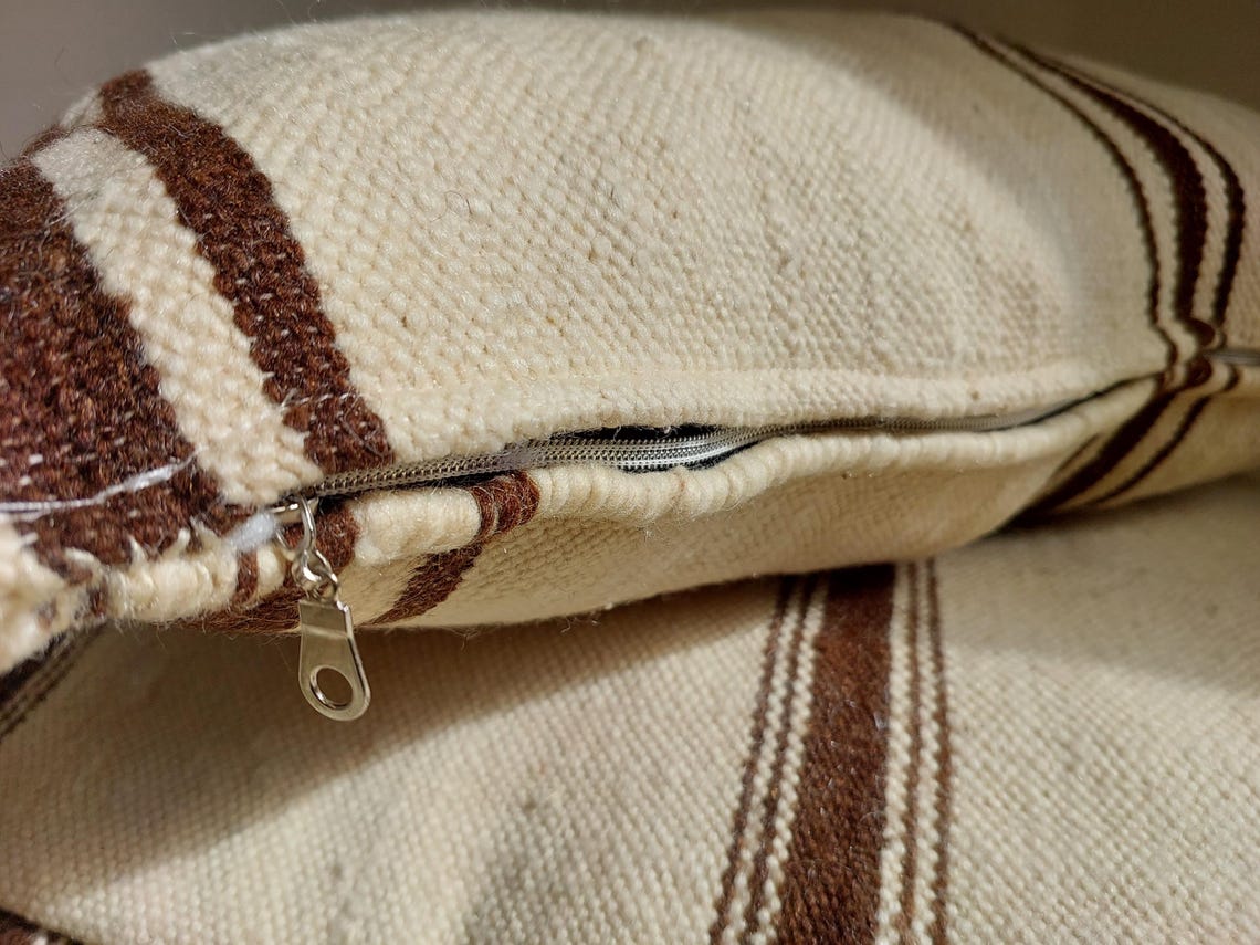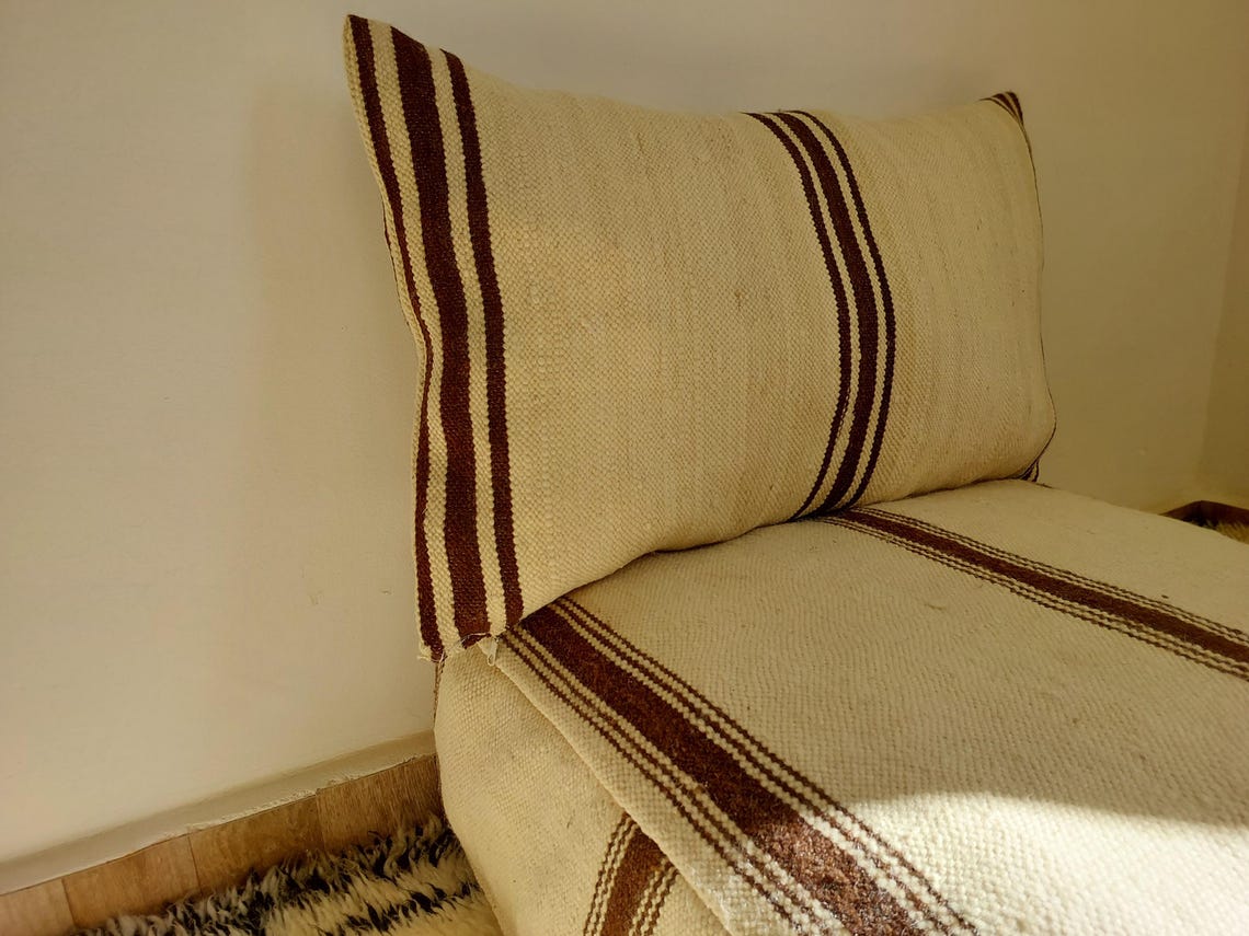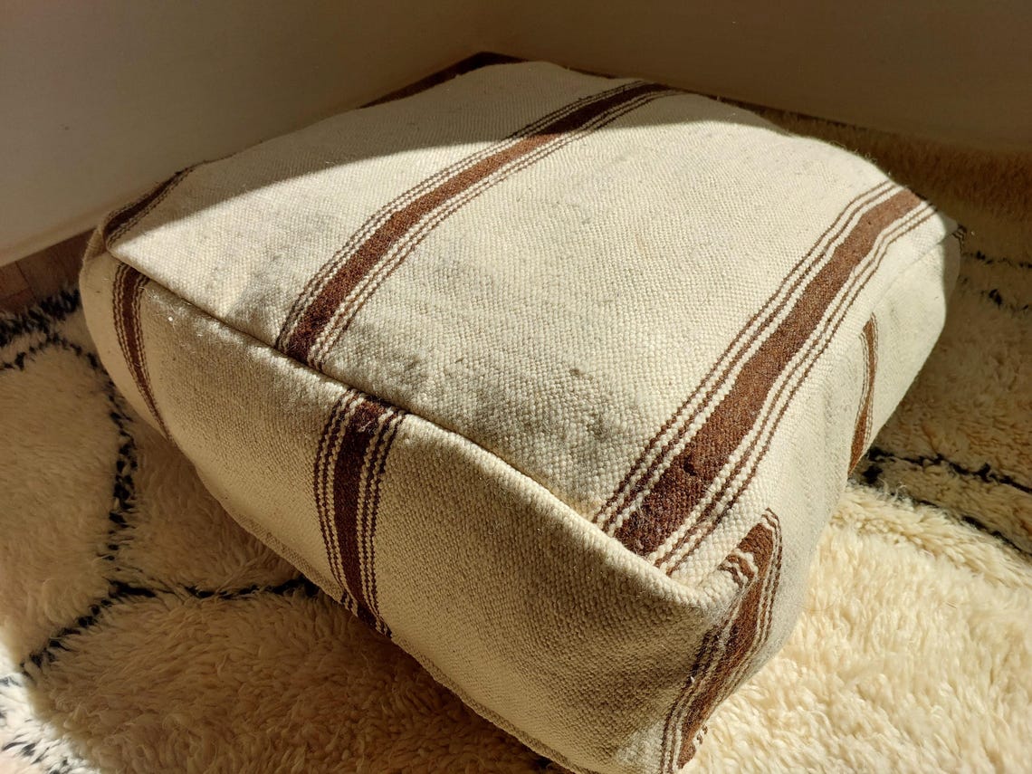 This set of two Moroccan poufs brings authentic Berber craftsmanship into your home. Refashioned from a vintage handmade flatweave wool blanket, originally handwoven from natural undyed wool, each piece reflects hours of meticulous work by Berber women and celebrates the heritage of their tribe. Perfect as floor cushions, ottomans, or decorative accents, these poufs add warmth, texture, and a bohemian touch to any living space. Each pouf is unique, showcasing traditional weaving patterns and natural wool textures.