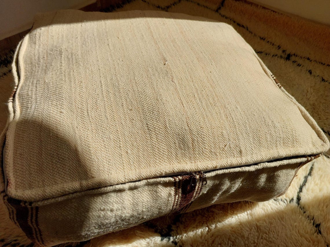 Vintage Berber Wool Moroccan Pouf Set With Pillow - Handmade Flatweave Ottoman Floor Cushions