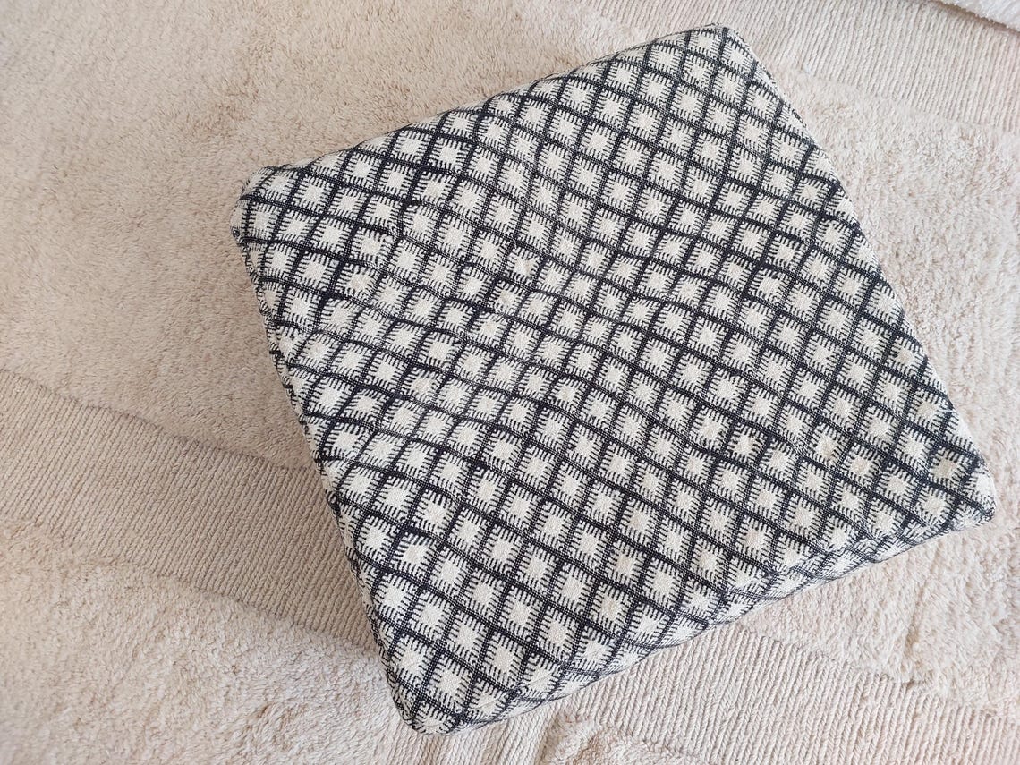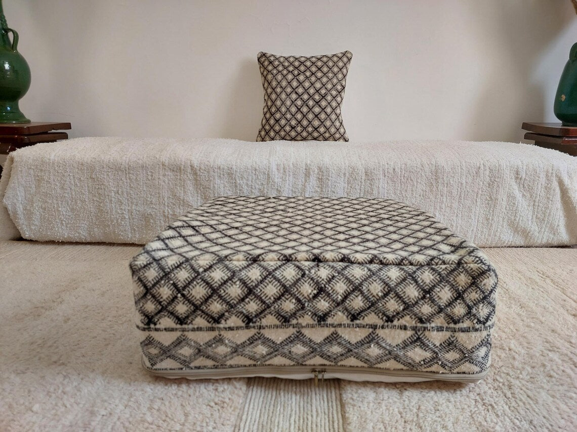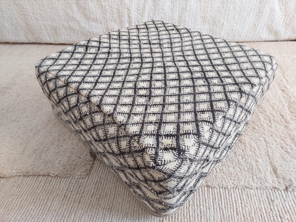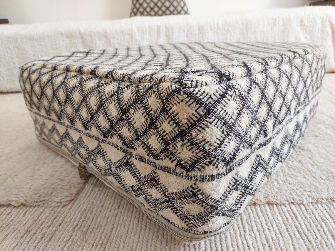 Vintage Moroccan Kilim Pouf: Handmade Berber Floor Cushion, Wool Ottoman, In Black And White