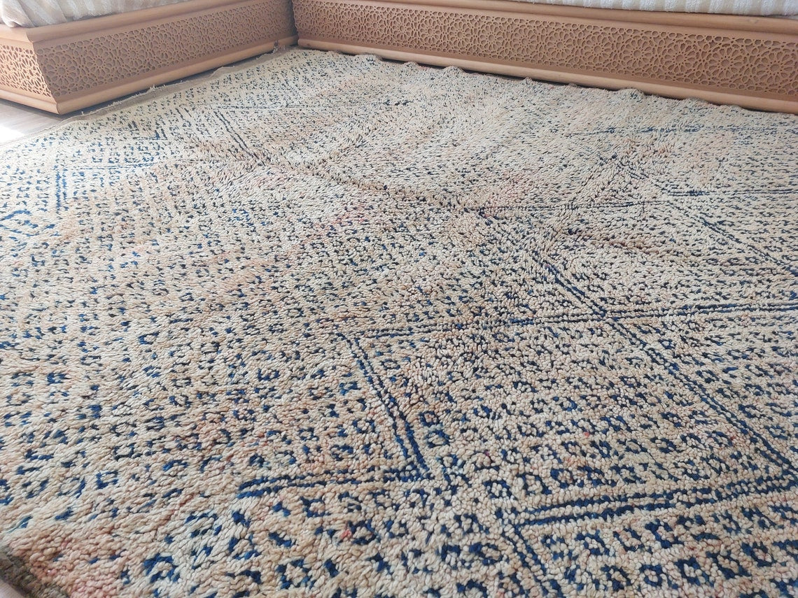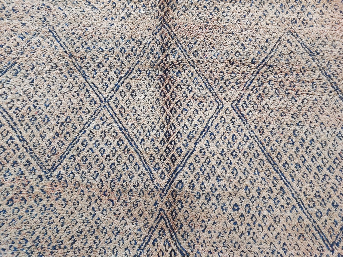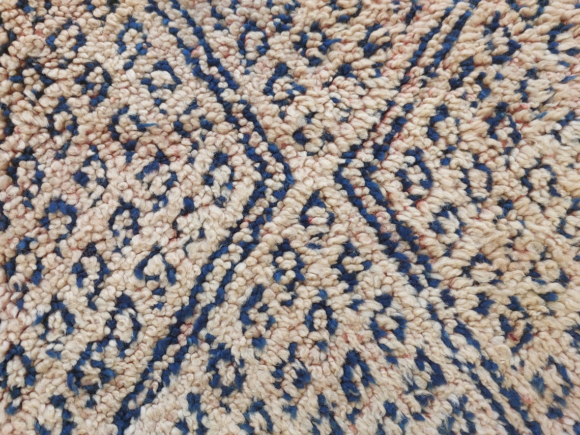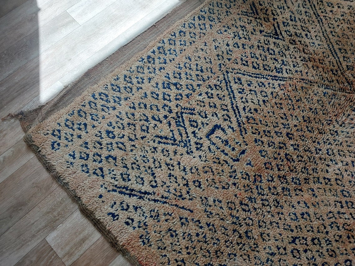 Bring home an authentic vintage treasure with this handwoven Moroccan rug from the Zayan tribe, a rare collectible adorned with deep indigo tones that confirm its pre-1950/1960 origin. This beautifully preserved piece showcases cultural artistry, timeless charm, and the rich heritage of Moroccan weaving.