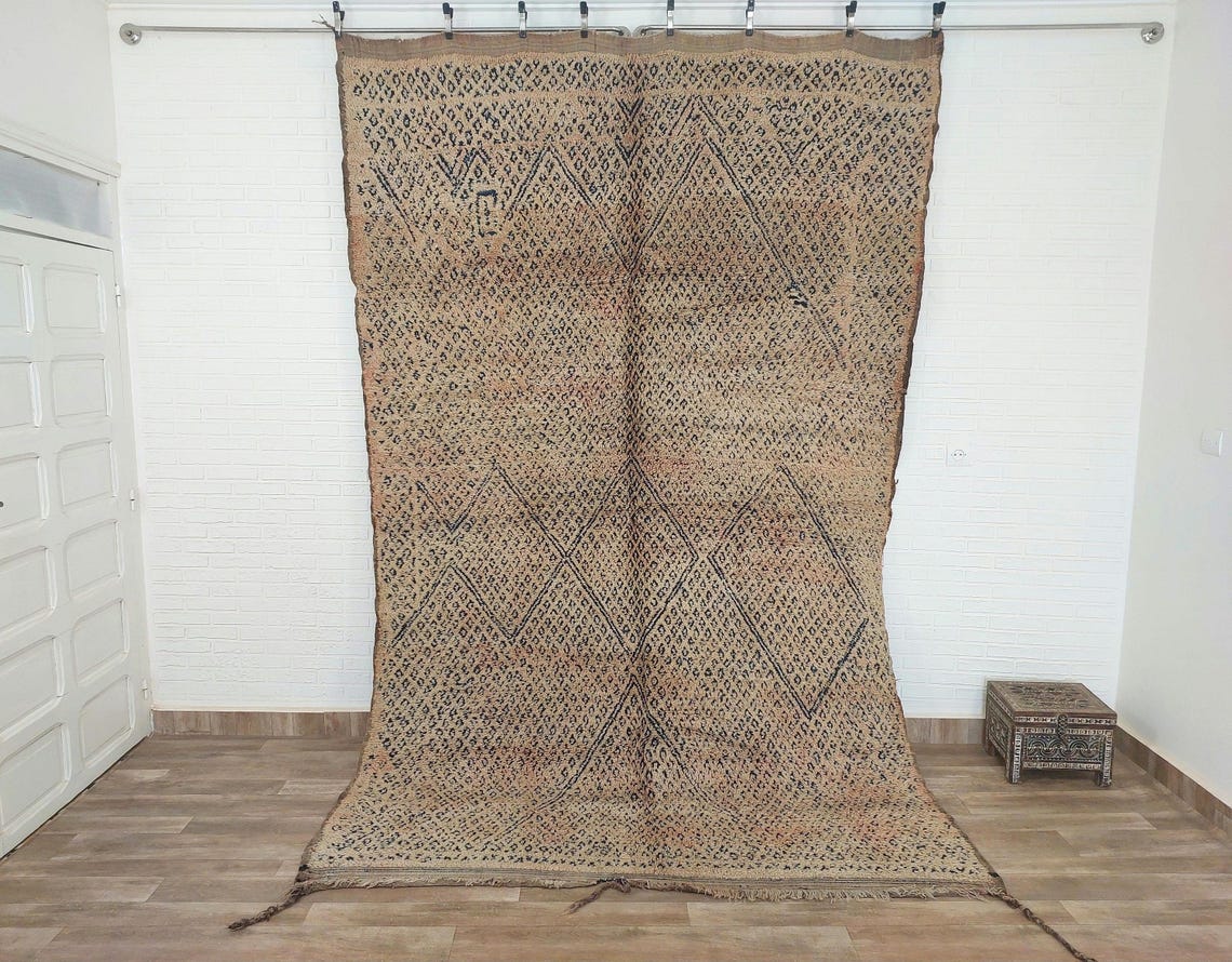 Because this rug is handmade, slight variations in weaving, pattern, or shape may occur. All vintage pieces have lived a previous life, so minor wear, discoloration, or small repairs are normal and add to the rug’s authenticity and unique character. Some worn areas or holes have been intentionally left unrepaired to preserve the integrity of the original artwork.